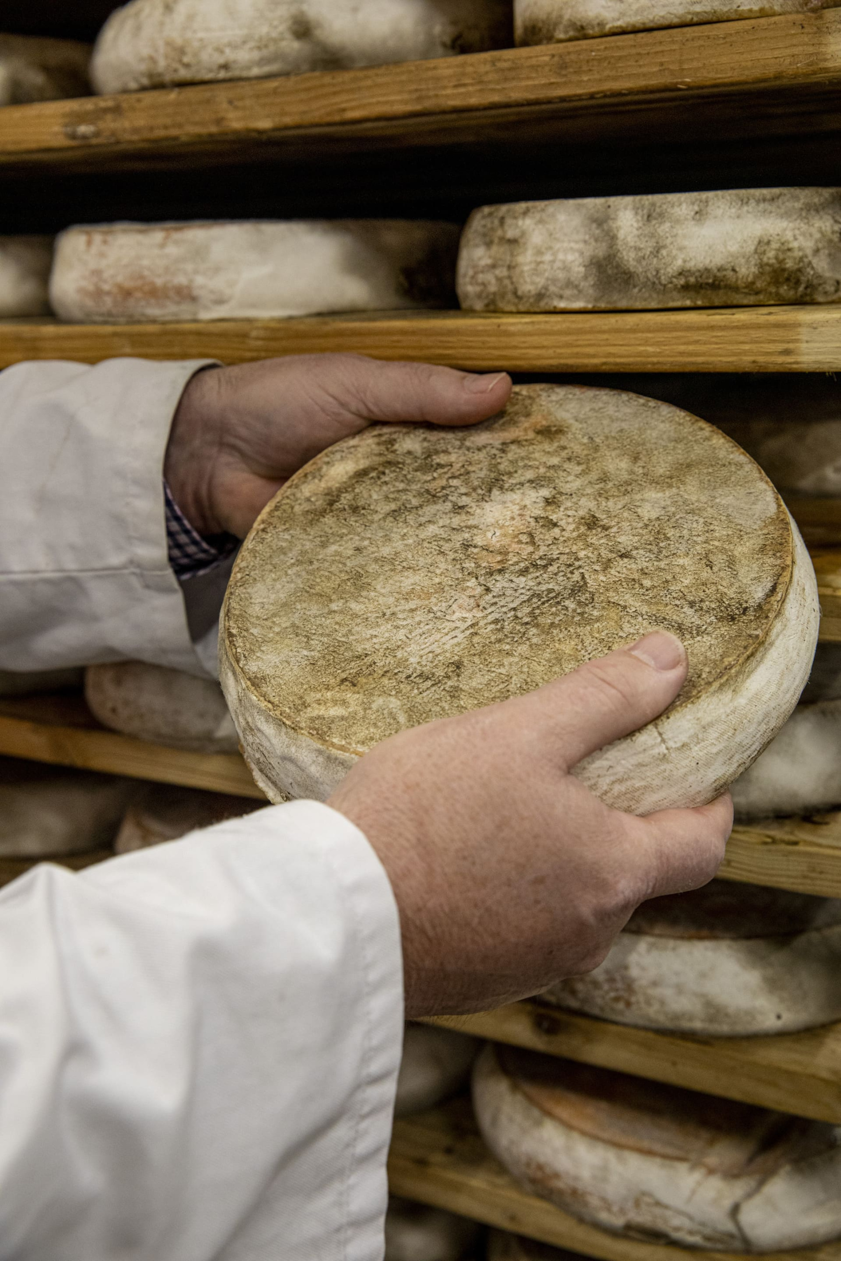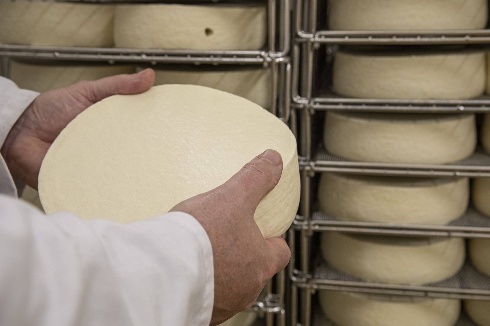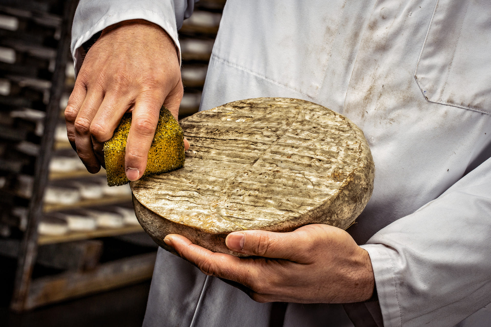 Le lait de nos producteurs est collecté jusqu’à notre fromagerie. Il est ensuite pasteurisé. L’étape suivante consiste à ajouter de la présure, qui mène au caillage du lait. Le petit lait est évacué, laissant la place aux grains de caillé, prêts à être pressés et moulés. Après avoir été fabriqués, les fromages sont lavés. Ils sont tous identifiés par une plaque de caséine carrée et translucide, qui est comestible. Elle porte toujours le numéro du département, une combinaison de lettres identifiant le producteur, et la commune dans laquelle il a été produit. La recette Wälchli est propre à notre fromagerie : nous utilisons des ferments traditionnels qui apportent une aromatique spécifique.